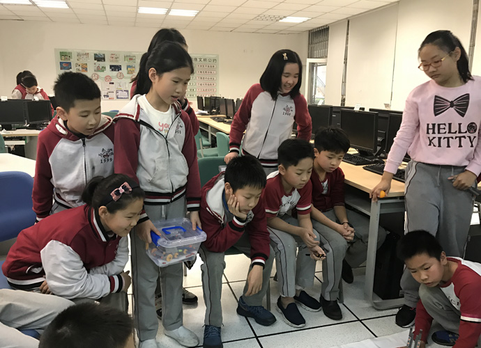 “老师,机器人拼装大赛培训是不是在这里?”一声声急切的询问声拉开了科技节系列活动四年级机器人拼装大赛的序幕。3月9日下午第八节课,C406电脑室挤满了来自四年级16支队伍48名参赛选手,他们大多没有接触过机器人,既兴奋又紧张。经过陈老师简短的培训,每一队参赛选手领到自己的“装备”认真地准备起来。3月16日下午4点,小选手们拿着自己拼装好的“武器”,信心满满地来到比赛现场。经过一个星期的准备,他们不再像培训时无从下手,三个队员分工明确,操作熟练,团结一致,摘果子、运果子、传送、分拣,对待每一个任务都不马虎。虽然他们是初次接触机器人,虽然2分钟的比赛时间对他们是那么短暂,但是他们表现出了绝对的责任心和团队精神,这远远比输赢的意义要大得多!