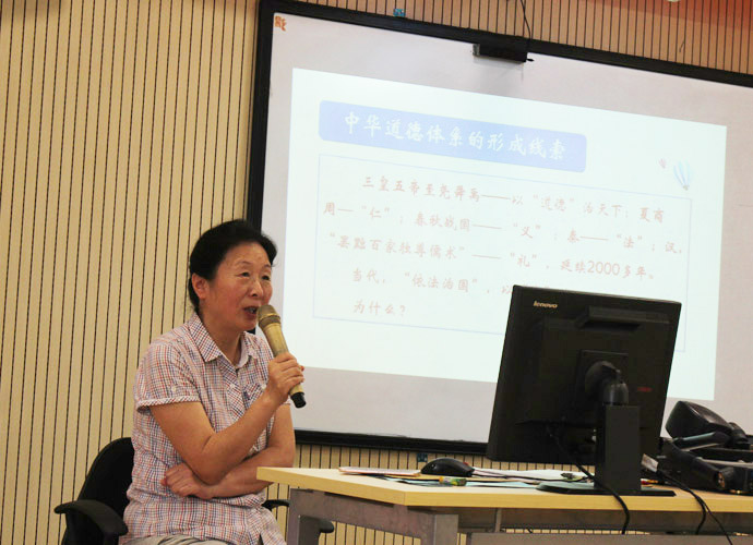 首先,杜卉督学以第一模块关键词为线索,通过“道德”—“职业道德”—“教师职业道德”的层层剥笋,阐述了从尧舜禹、夏商周、秦汉至今,中华道德体系的形成过程和历史演变。涵盖家庭道德、职业道德、社会道德的各个层面。她由“五伦、五常、四维、八德”,过渡到“武德”、“兵德”、“医德”、“商德”、“政德”……,最后将重心落脚到教师职业道德,透彻地解析了教师职业道德的方方面面。老师们不仅聆听了专业性的理论讲座,同时也经历了一次道德观念的心灵净化。