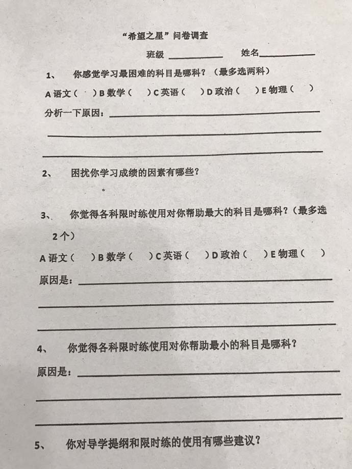 最后周主任给这些学生送了一份特殊的礼物,一份“希望之星”问卷调查,问卷中涉及了如下问题:你感觉最困难的科目是哪些学科?困扰你学习成绩的因素有哪些?你觉得限时练习对你有帮助的是哪些学科,原因是什么?你对导学提纲和限时练有哪些建议和想法。同学们都进行了认真的回答。