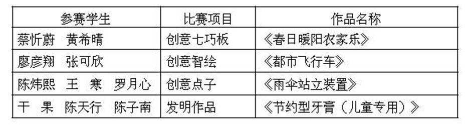 本次活动包括两大类别(科技创新类、发明作品类)共6个比赛项目,我校小学部由信息技术科组和科学组负责,美术组老师提供帮助,辅导学生参加了创意七巧板、创意智绘、创意点子和发明作品四个项目,最终提交了五份作品,其中四份作品脱颖而出,顺利进入决赛。