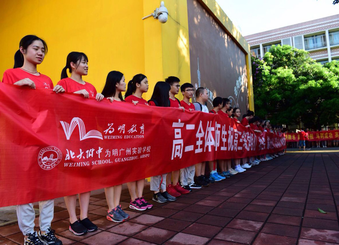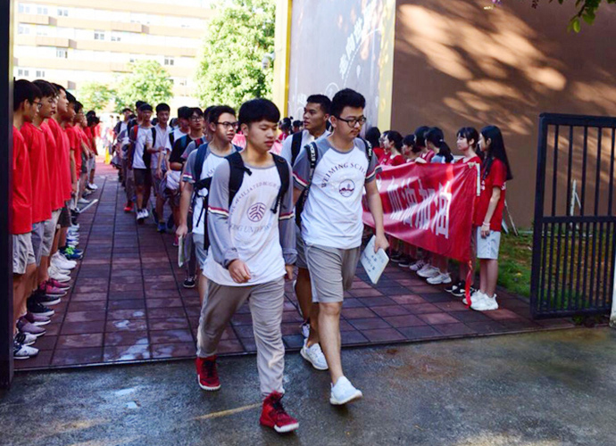 2017年6月7日,这个“特殊的日子”牵动着广州为明学校所有师生的心。早上7点,罗马校区高二年级的全体师生已经在操场上整齐列队,为即将踏上高考征程的高三学子夹道送行。“十年磨剑,一朝腾飞;蟾宫折桂,舍我其谁!”的励志标语抬头可见,振奋人心;高二的学弟学妹们更是口号响亮,真诚地祝福学长学姐们旗开得胜,马到成功。高挂着祝福标语的大巴车早已在校门外等候,为孩子们送行的家长纷纷感慨道:“学校什么时候也没忘了对我们的“双服务”承诺:服务学生健康成长,服务家长安心工作!能把工作做到这一步,孩子们考试顺心,我们更放心。”