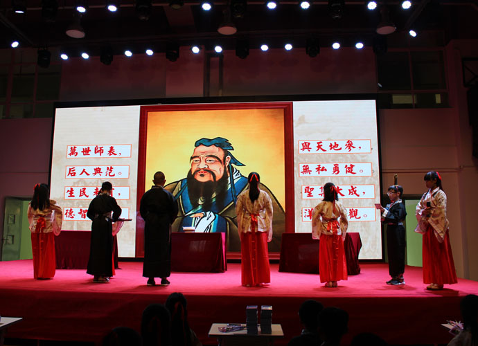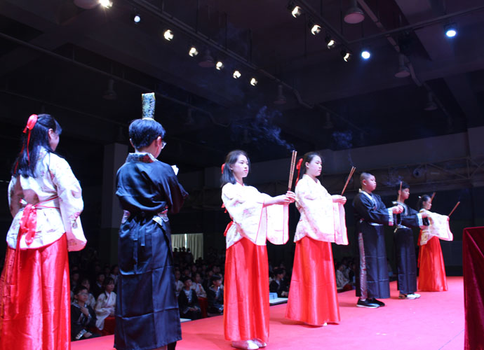 “圣人德智,启迪化育。指点迷津,拨云见日。德与天齐,道冠古今。后人敬仰,至诚拜祭……”五位学子代表执香,以汉代“趋礼”上台,在阵阵鼓乐中,与台下二百余学子一起,以“正拜”之礼,祭奠先贤孔圣。随后,所有学子齐诵《论语》经典,重温儒家思想“五常”——“仁、义、礼、智、信”。