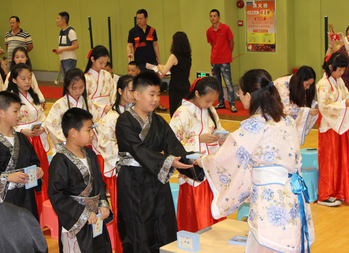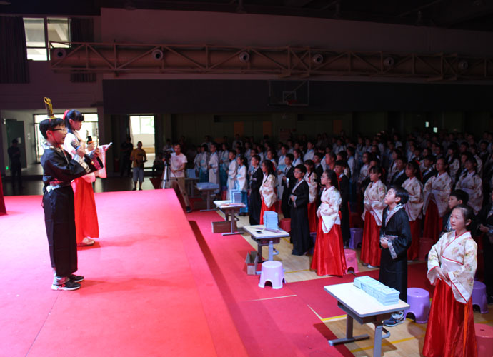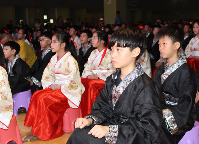 2017年6月21日上午九时许, “为明星”艺体中心,鼓声隆隆回响,恢弘汉乐奏起,六年级全体学子均着汉服——男生朱子深衣,女孩裙裾彩服,现场庄严肃穆。这是北大附中为明广州实验学校为小学部六年级学生准备的毕业典礼——一场丰富的“汉唐文化”饕餮盛宴。