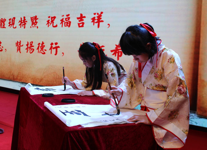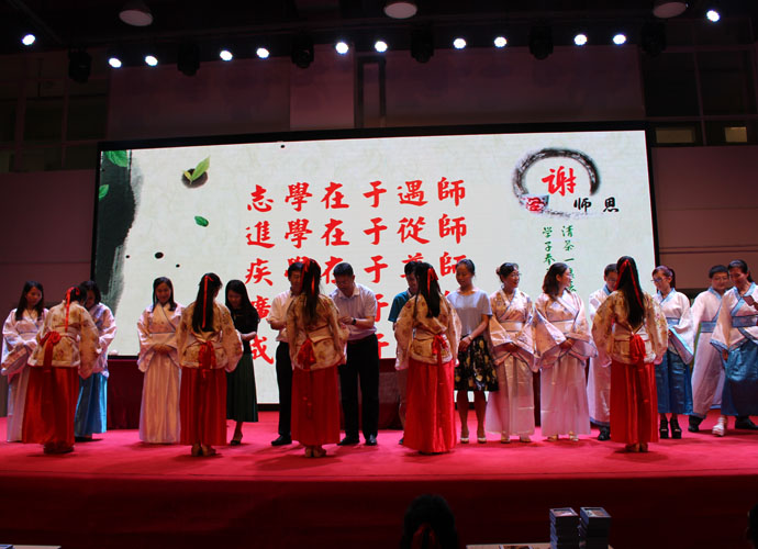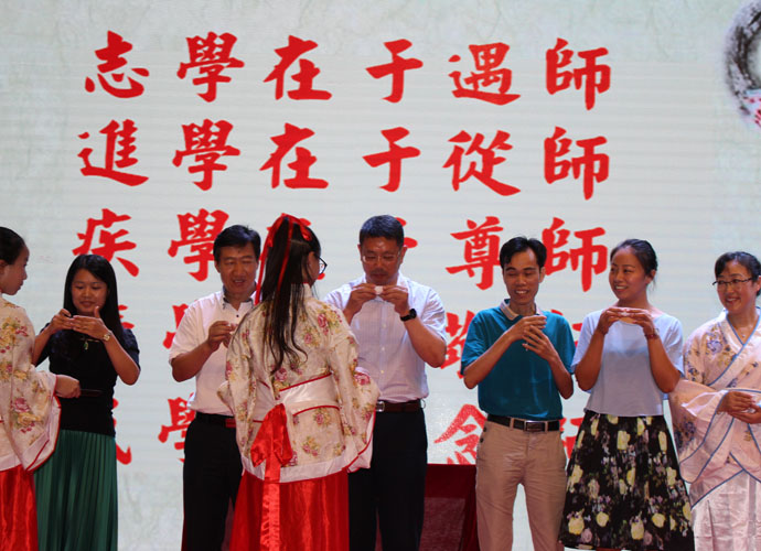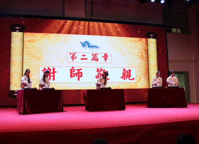 悠扬古乐声起,五位女童演示“茶道”,身静如山岳磐石,面笑如春花晓月,动作行云流水,展现了为明学子的“秀外慧中”。茶道表演结束,给予过学子教诲的所有恩师上台,接受敬茶及所有学子的三拜之礼。遇师志学,从师进学,尊师疾学,敬师广学,念师成学,师恩不忘,永记心中。
