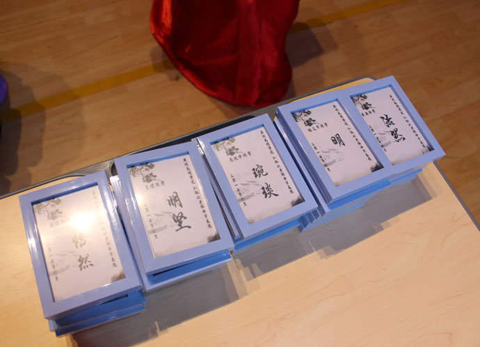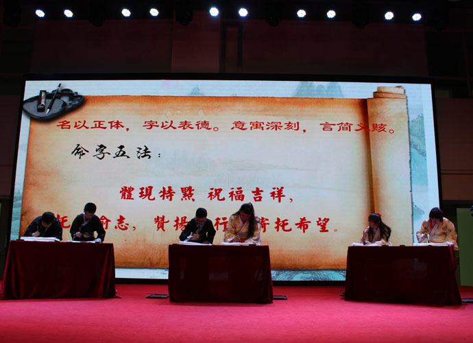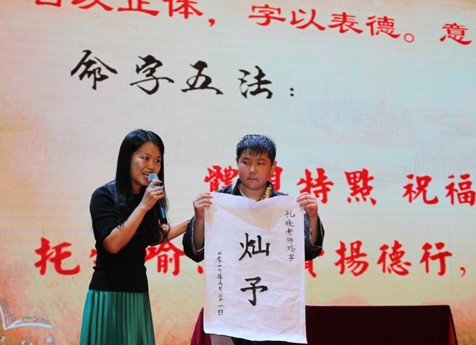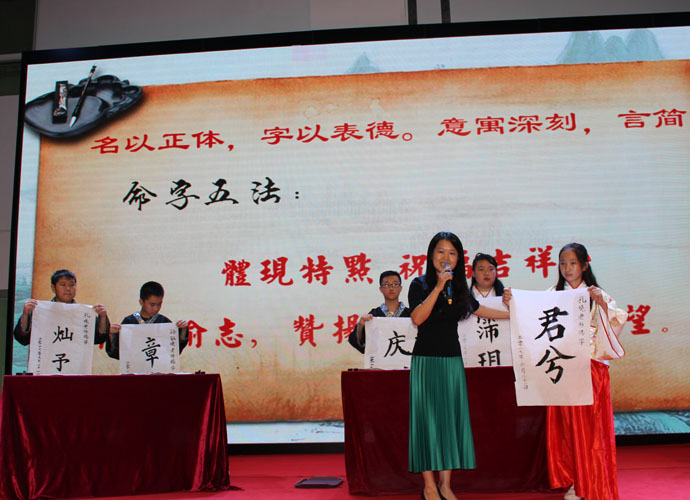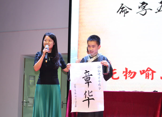 名以正体,字以表德,有名无字,美中不足。名字俱全,中华传承。学子六人,执盘上台,悠悠乐曲声中,开始现场书写“表德之字”。一曲终了,六位学子展示作品,笔法严谨,字体工整,尽显为明善教之力。小学部龙主任走进六位学子之间,谆谆言语,将所表之德,化作对学子的殷殷期望。台下,老师们也将装裱好的字框,郑重赠于学子。