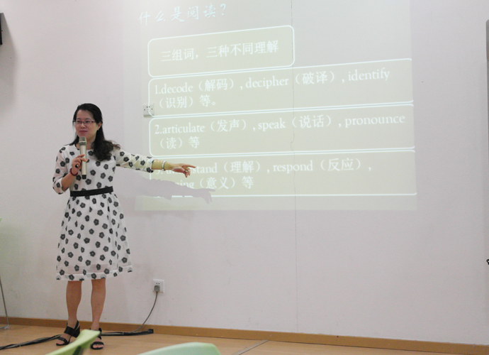 上午进行的是第一个主题——英语阅读教学。 首先李校长抛出了一个开放性的问题:什么是阅读?老师都积极的表达了自己对“阅读”二字的理解,同时在专家的引领下,我们对阅读的作用、阅读的类型、阅读模式、阅读教学的常用策略、选取阅读材料的原则、英语阅读教学的基本方式、英语阅读教学的三个阶段、十种阅读技巧、阅读教学原则与实践等有了更深的理解。