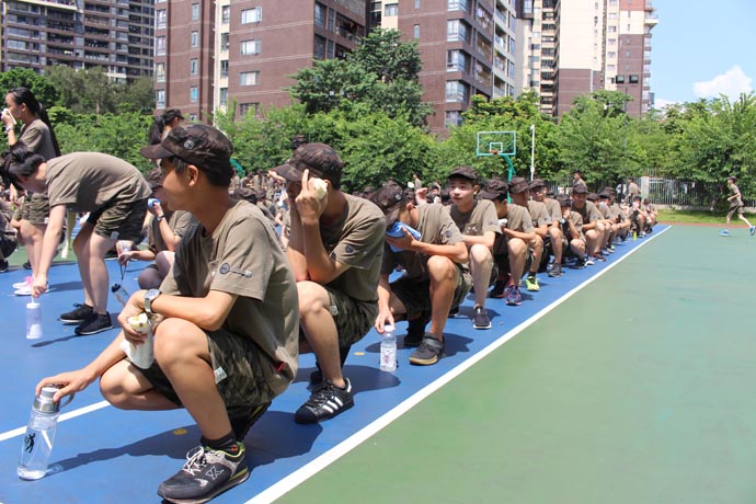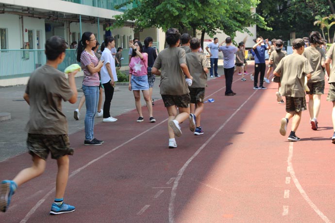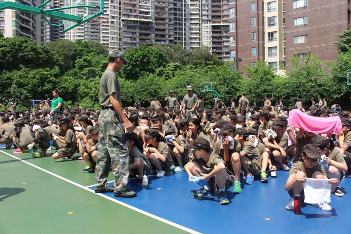 中午1点50分,烈日当空,军训疲惫的孩子们正在酣然大睡,警报声响起后,孩子们在生活老师的指导下,弯着腰,用湿毛巾捂着口鼻,沿着各自楼层的逃生路线快速下楼,直奔空旷的操场。到达安全地点后,由教官整队,清点学生人数,并向总指挥于校汇报人数。孩子们态度认真,严肃对待,整个演练过程快速、安全、有序。