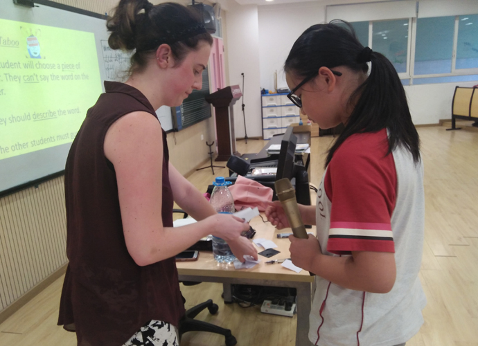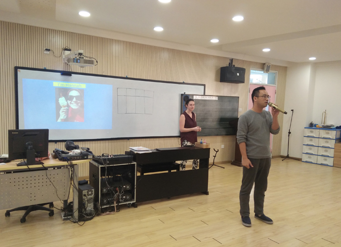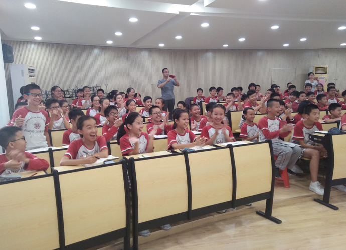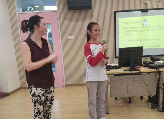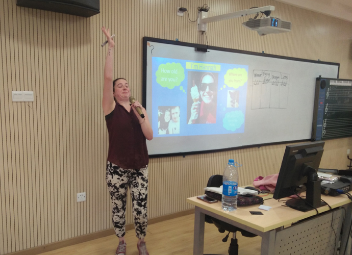 在老师的带领和组织下,同学们陆续进入教室。Hannah老师在热烈的掌声中,开始了娱乐课程。同学们都跟着老师的节奏时而幽默、风趣,时而轻松、从容,时而认真、严肃。