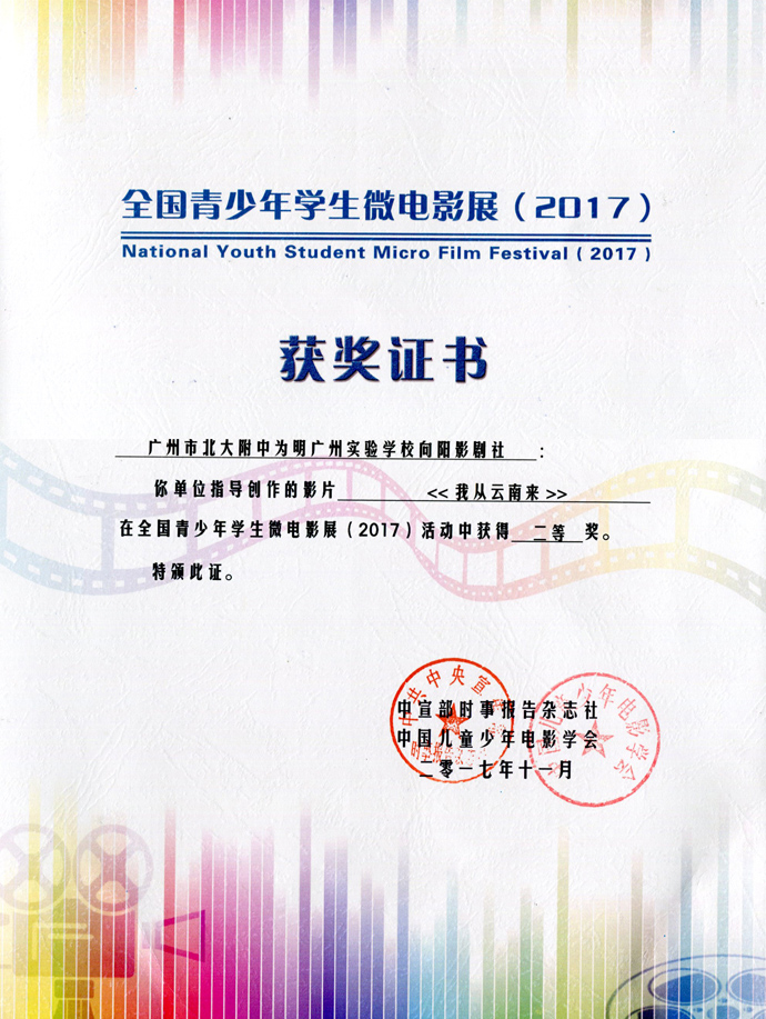 微电影课程从2007年开课至今,学校微电影作品在国内外各级各类大赛:包括魅力岭南DV大赛、羊城印象—国际微电影大赛、广州校园微电影大赛、广州市校园艺术节、中国青少年微电影公益大赛中屡屡获奖。摘得广州市一等奖、最佳导演、最佳男(女)主角等几十个的奖项。微电影活动还被评为广东省优秀德育案例。