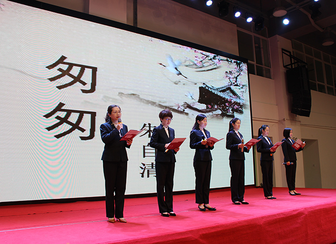 小学部6位语文教师在台上一字排开,惊艳全场;当她们“串越”古今将惜时名文徐徐道来,学生们爆发出雷鸣般的掌声: