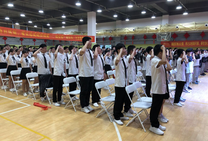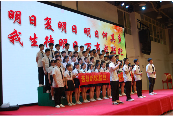 本次誓师大会由苏拉、殷伟豪同学和黄令红、王合刚老师联袂主持。雄壮的国歌声中,初三全体学子整装待发,斗志昂扬。