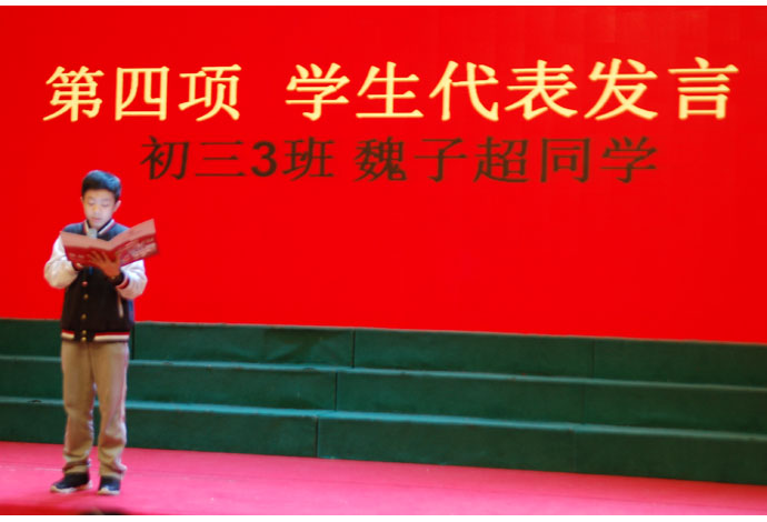 初三(3)魏子超同学代表初三学生发言。作为一个初三才进入为明的新生,他特别感谢老师和同学们给他的温暖和帮助,感谢为明广州给他的学习带来的进步和飞跃,并表达了和同学们一起奋斗和拼搏的决心和信心。