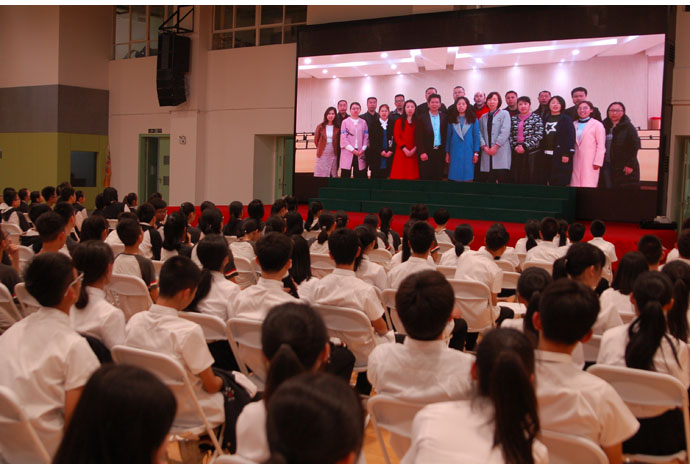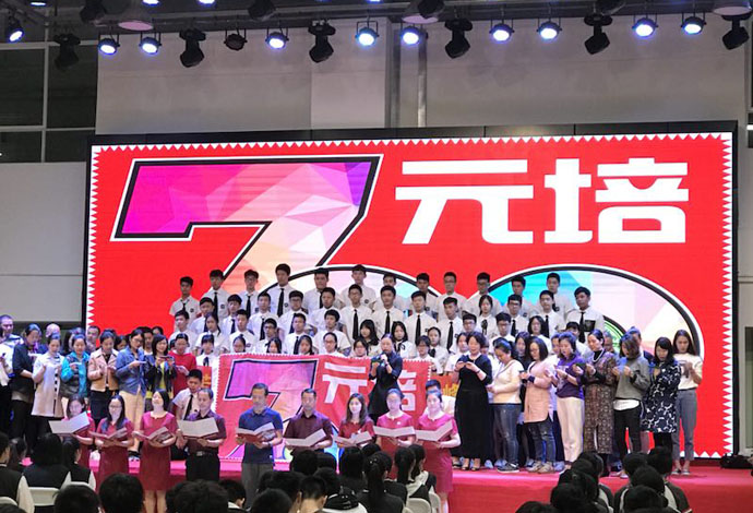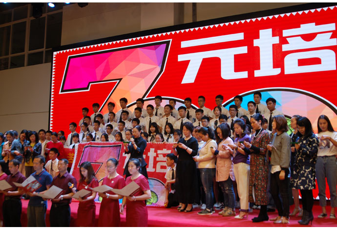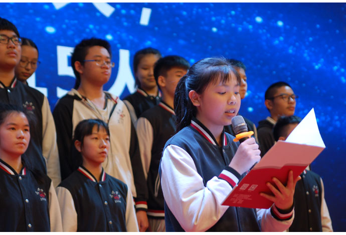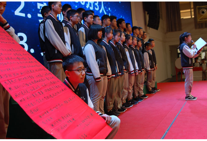 最后出场的是元培级部。作为我校首届元培班,他们承载着领导和老师们的厚望和重托,他们也用自身实力证明了自己。他们形式活泼新颖,从环节设置到人员构成无不彰显两位班主任的良苦用心。男生上着白色衬衣,下穿黑色长裤;女生上著白色衬衣,下穿黑色短裙。统一系黑色领带。元培团队一出场便青春靓丽,让人赏心悦目。集体朗诵,再加学生自己重新改编的《明日歌》,处处在彰显元培学生的激情和斗志。最后的宣誓环节更是令人震撼:在周柏森同学的战鼓声中,在郑文荣同学的铿锵号令下,元培级部的家长、教师齐上阵,共谱师生同心、家校共进的动人篇章!偌大的“为明·星”艺体中心里,久久回荡着“元培,元培,舍我其谁!元培,元培,舍我其谁!” 的壮志豪言。