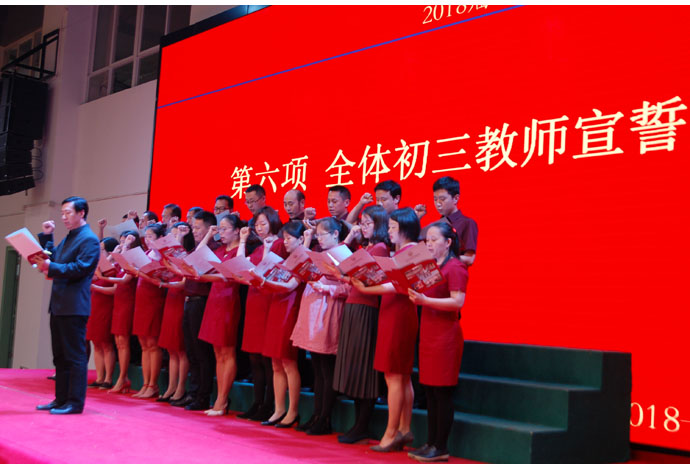 恩师相伴,学子不会孤单。于校长带领全体初三教师走上舞台,深情告白:让我们同心协力,奋战一百天。让飞翔的梦在六月张开翅膀,让雄心和智慧在为明闪耀光芒。随后刘飞、周文涛主任带领全体初三教师郑重宣誓:我们会勤于付出,甘于奉献;精心备考,刻苦钻研;严谨细致,率先垂范;我们会与你们同甘共苦,为你们保驾护航,会与你们一起挥洒汗水,决战中考,创造辉煌!