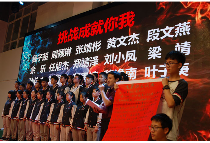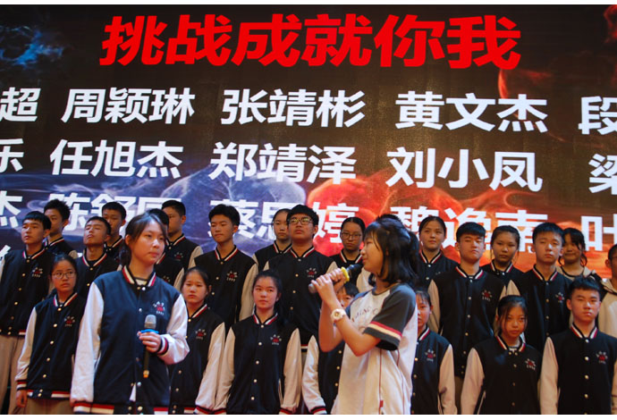面对挑战,初三(6)班陈嘉莉同学代表班级发表应战书,全班同学以自信和坚定回应:挑战面前,困难与希望同在。我们要攀登,谁也挡不住我们前进的脚步;我们要飞翔,谁也阻止不了我们腾空的希望!我们已下定决心,我们会不畏艰险,我们能排除万难,我们终将迎来最后的成功!