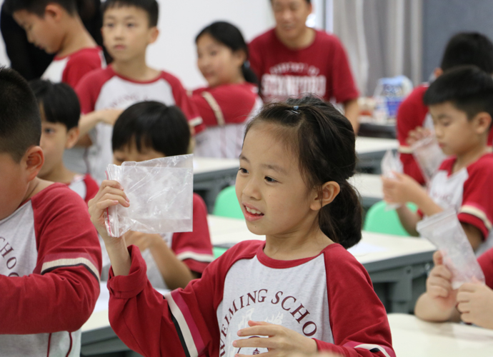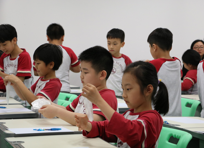 此次培训内容分授课和讲座两场进行。上半场彭老师为三年级孩子带来了一堂内容丰富多彩的科学探究活动课。以“什么是科学探究”提问切入,引出了启发学生智慧思考的八小科学探究活动,即科学小实验、科技小制作、科学小发明、科学小创造、科学小养殖、科学小种植、科学小观察和科学小调查。紧接着彭老师围绕如何利用我们身边最原始的工具和原始的技术开展科学探究活动,用实验向同学们一一展示,如:“会鼓的密封袋”,“水滴牙签五角星”,“奶茶吸管会唱歌”等。通过彭老师相对应的实验展示,学生们不仅真实的感受到了“科学就在身边”。而且学生在提问中思考、在实验中发现与表达、在谈话中分析,激发了学生对神秘的科学的向往。