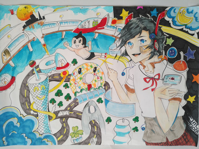 龚卫平老师带领同学们已经是第11次参加这个比赛了。该比赛分为两个阶段,现场赛对第一阶段的作品进行颁奖。本届比赛的九名同学中七名获奖。其中来自初一6班的陶昱遐同学获得一等奖。她利用本学期初一学习的点、线、面知识,以青花瓷为元素,构想未来城市交通发展的面貌,具有鲜明的风格特征,充满奇幻想象。