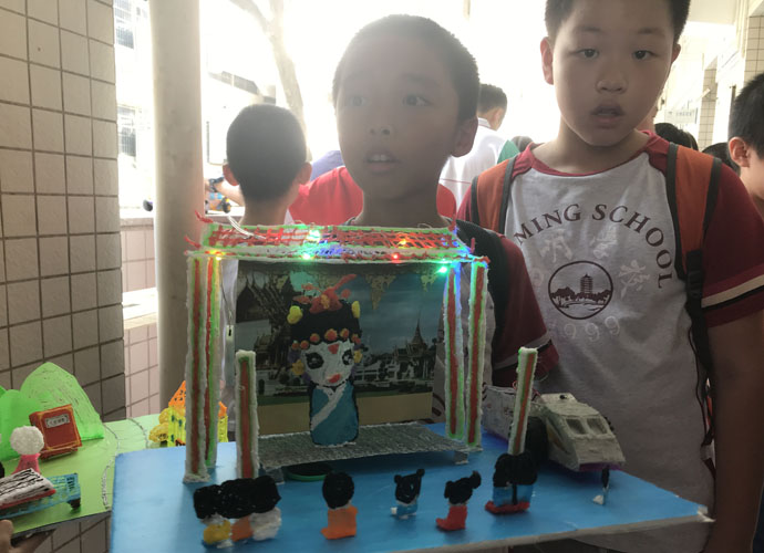 3D创意智绘的主题是“我们走在一带一路上”,最初拿到主题,孩子们是一脸茫然的,经过陈老师的点拨,孩子们发散思维的讨论,确定了“汉语辞典”“京剧脸谱”“通讯卫星”三个礼物,通过“一起学汉语”“京剧泰国行”和“通讯卫星互联你我”三个场景,表达在“一带一路”交流合作中,弘扬中国传统文化和传递中国先进科技的意义,独特的礼物设计和细致的场景制作,为作品加分不少。发明作品和创意点子,我们结合寒假综合实践作品进行了修改和完善,实现一个作品多项成果。