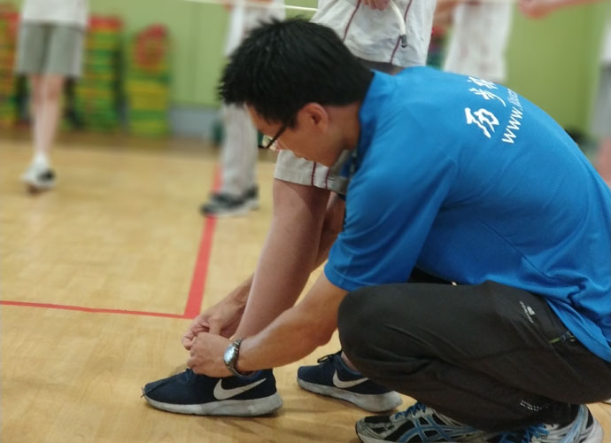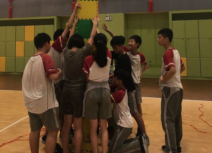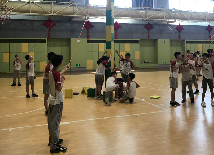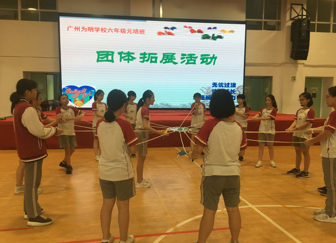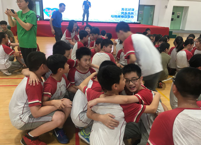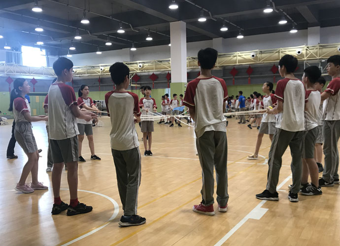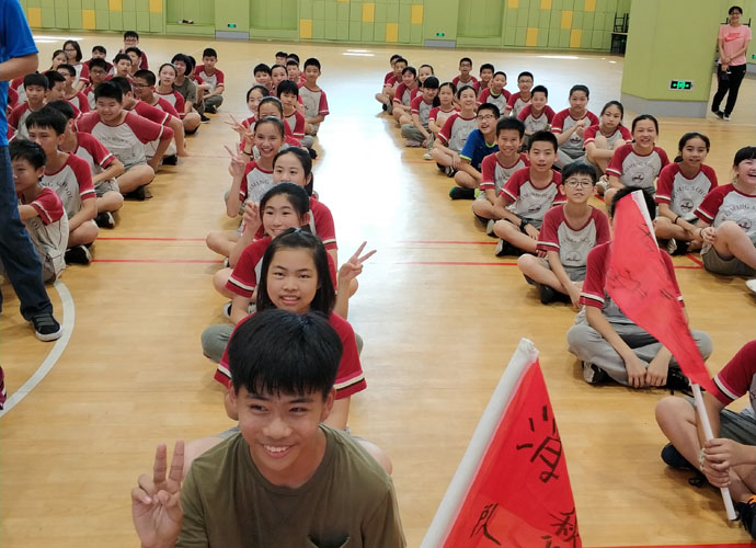 陈泽今:“大家都疑惑不解,但老师偏偏神秘兮兮的,一路上不禁浮想联翩。后来我们在老师的带领下,来到了艺体中心,一切才都恍然大悟了。‘团体拓展活动’几个大字被投影在大屏幕上,几个身穿海蓝色上衣的教练们围在四周。接下来活动就在热情与期待中展开了。”