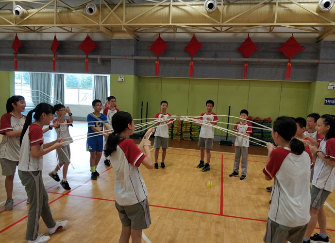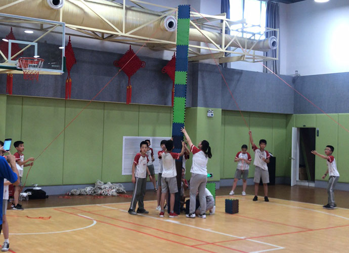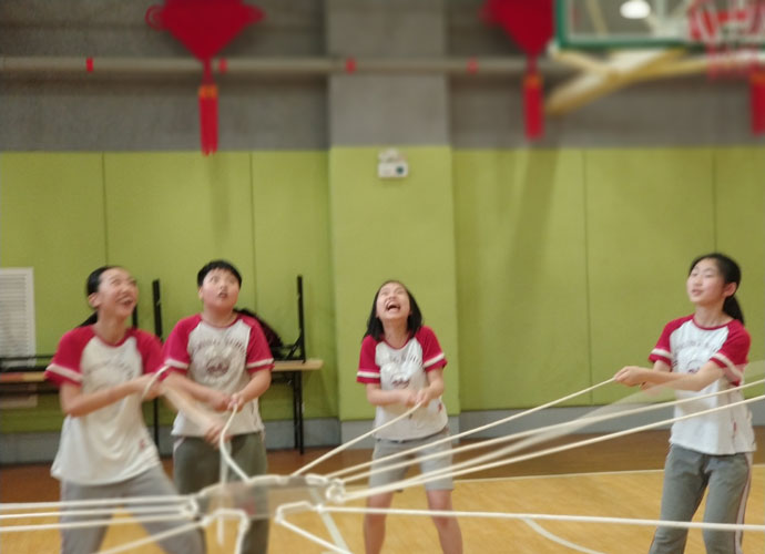 张峻铭:“纤维板周围是12根绳子,队员要拉住绳子使纤维板悬空来颠球。教练宣布完规则后就是十分钟的练习时间。”