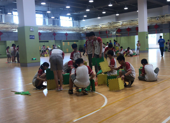 赖柔宏:“用海绵垫一层层搭上去,层数高的获胜。我们都采用三角形搭法,这样不容易倒塌。可是怎么稳住它呢?”