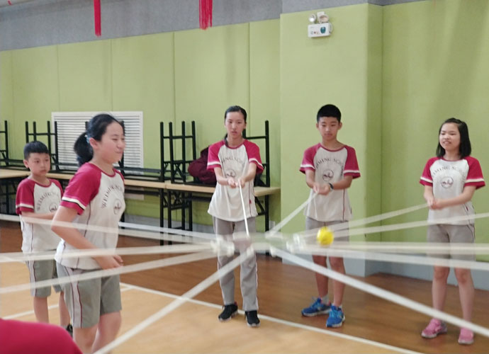 区嘉琪:“哇!同学们一脸好奇地张望着:这是啥?渔网?蜘蛛网?随后教练变魔术似的拿出两个球。”