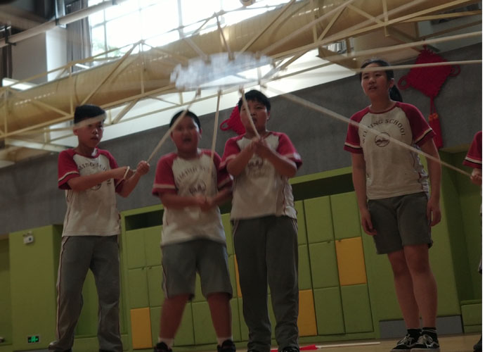 陈泽今:“组员们‘狠狠地’扯着绳子,一路试验,从球屡次掉落到可以一次性跳十来个。到我们组上场时,大家未等开始便冷汗津津,生怕自己输掉。比赛开始了,大家浑然忘我,眼里只有球。当结束时,才发现手已经麻木了,绳子末尾的橡胶都被融化了,粘了一手。”