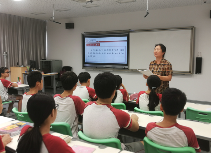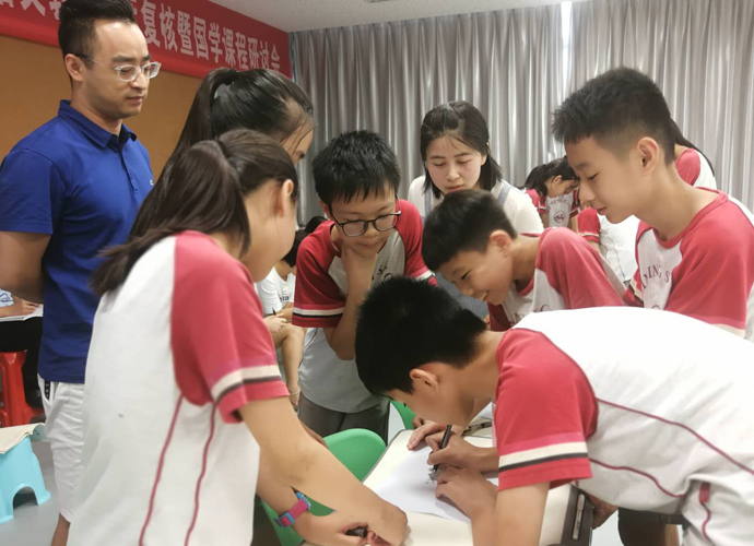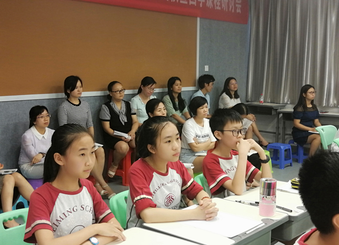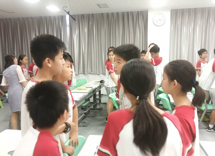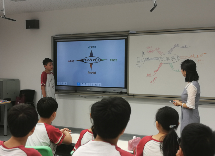 英语课上,彭娜老师通过“思维导图知多少”的游戏让学生回顾画好思维导图的几个要素,接着选用本学期元培班使用的七年级上和六年级下的教材中共同话题作为主题。通过四步法引导并激发学生思维的开阔性和灵活性。