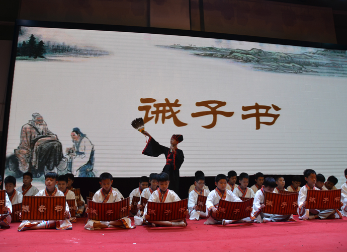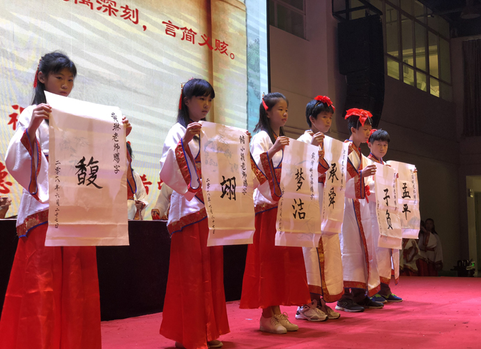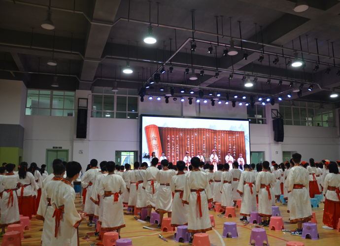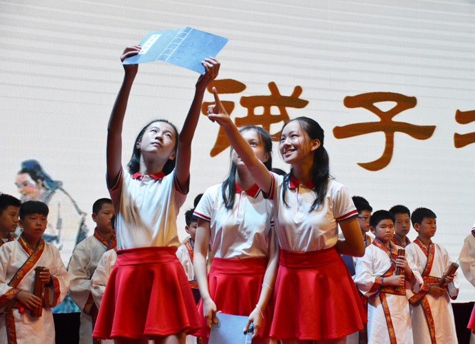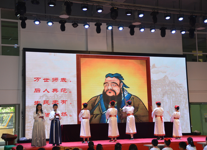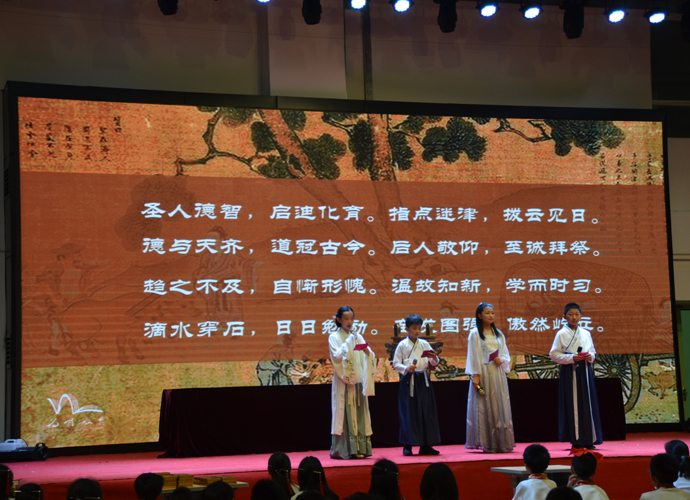 温婉清雅的女生,俊朗不凡的男生,一字一顿地念出“圣人德智,启迪化育……德与天齐,道冠古今。后人敬仰,至诚拜祭……”五位学子峨冠博带,赫赫威仪,执香上台,正立拱手。在阵阵鼓乐中,进香鞠躬,与台下六年级学子一起,祭奠先贤孔圣。随后,齐诵《论语》经典,重温儒家思想“五常”。深读之,细品之,巍巍神州,荡荡德风,惟圣之德,万世永馨。明德守礼,中华魂灵。