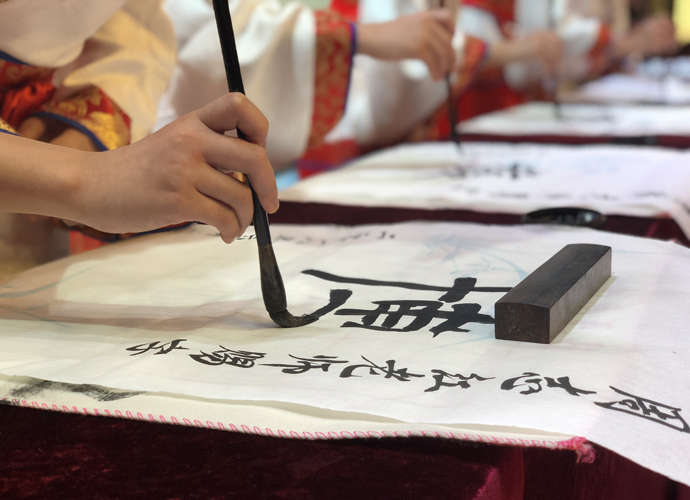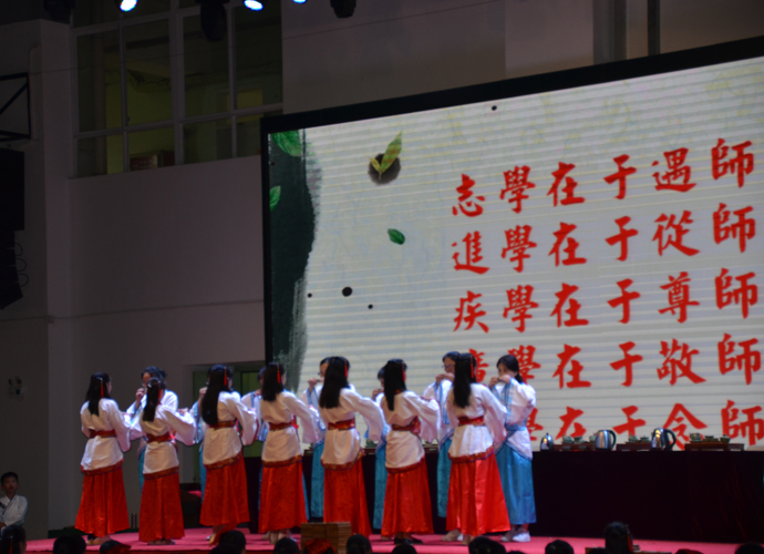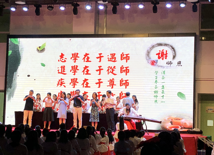 悠扬的古乐《山水情》声起,七位女孩身着最端庄的嫣红衣缘的素白汉服,举手间,翩翩大袖行云流水;煮茶时,长风盈袖衣袂飘展。面对恩师,她们执壶斟茶,鞠躬行礼、奉茶言谢。忘不了是您把我们领进知识的圣堂,忘不了您的循循善诱,谆谆教诲;忘不了是您温柔的鼓励让我奋起前行 …… 古人曰“借得大江千斛水,研为翰墨颂师恩。”师恩不忘,永铭心中。