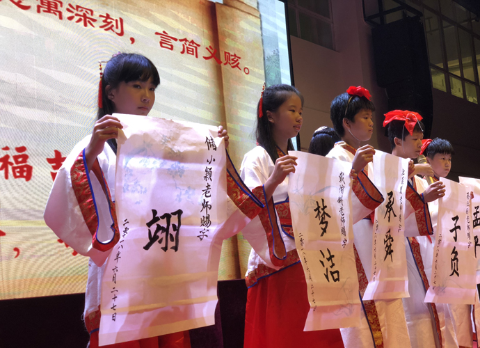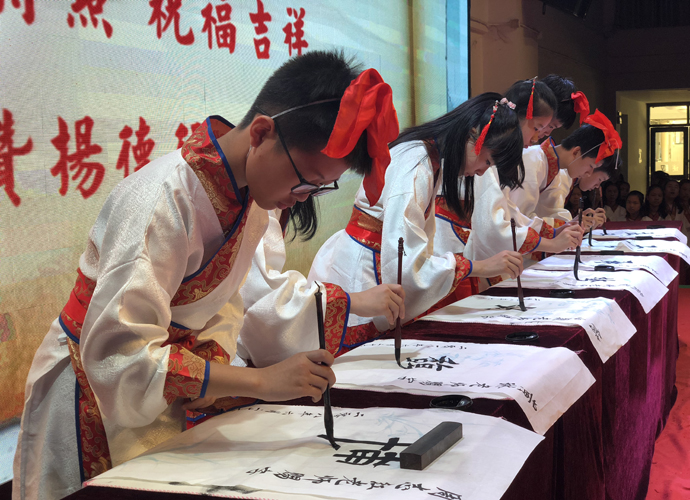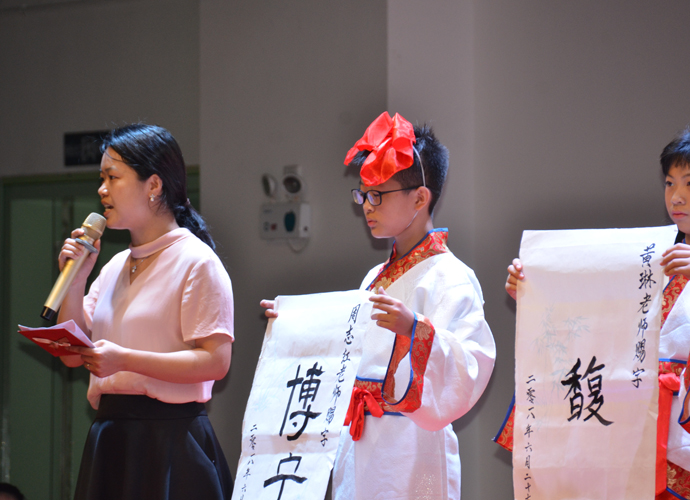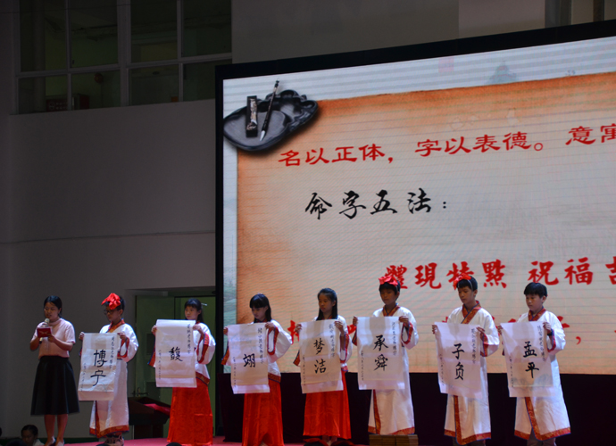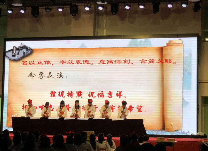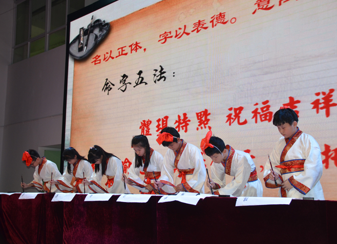 情溢校园,祝福满园。“名以正体,字以表德,……祝福吉祥,寄托希望……”古乐开卷,落墨生香。学子七人,在悠悠乐曲声中,研墨执笔、静心书写“表德之字”。一曲终了,七位学子展示作品,或苍劲流畅,或含蓄秀美,或端庄严谨,尽显为明善教之力。龙主任来到会场,谆谆言语,深入浅出,将所表之德,詮译成对学子的殷殷期望,字字是情,句句是爱。台下,老师们将精装的字框,郑重赠于学子。
