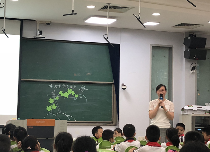 龙老师教态平和,面带微笑倾听每个孩子的回答,整堂课更是幽默叠出,让学生在轻松的氛围中学。教学和板书的设计也很精巧,龙老师一边在黑板上画葫芦藤, 一边让学生用……的葫芦藤来形容,直观明了。同时,龙老师引导学生从颜色、形状、气味等方面来形容……的小花、……的小葫芦,教给学生思维方法。