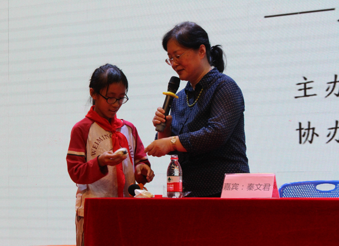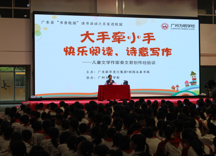 10月26日,我校联合广东省新华书店开展“名家大师进校园”活动,邀请了著名儿童文学作家秦文君女士走进为明、走近孩子身边。她以“大手牵小手——快乐阅读,诗意写作”为题,分享了自己生活中关于阅读和写作的真实经历。