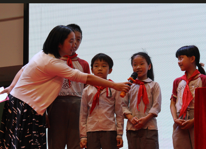 秦文君老师还向同学们推荐了近年来原创幻想作品佼佼者——上海儿童文学作家共同策划的作品《小熊包子》,该作品围绕“陪伴”和“成长”的主题,讲述了三年级小男孩熊豆豆和名叫“包子”的小熊之间发生的一系列冒险故事。秦老师边讲故事,边做游戏,调侃道:“小熊包子躲到了王校长的办公室,你觉得会在哪里呢?”,孩子们积极踊跃争相上台;当秦老师向同学们提问这个会魔法的“包子”将会变成什么的时候,孩子们脑洞大开说变成了“隐形人”。