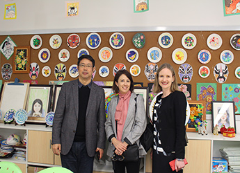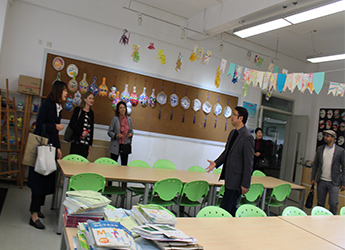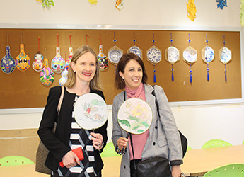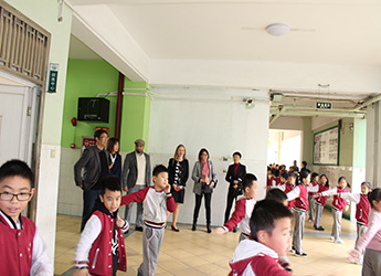 春天的校园被树上的新绿和紫色的羊蹄甲点缀地春意昂扬。参观校园途中,最吸引他们驻足参观的是坐落在操场的宿舍区。一是在国外很少见到如此规模庞大的宿舍区,二是所有的宿舍都保持地干净有序,床铺整齐划一。当听到小学一年级的孩子也能在老师的指导下独立完成铺床、洗衣等日常事务时,澳洲的代表团对学生的独立能力和学校的生活习惯教育加以赞赏。王校一路陪同参观和介绍,澳洲访问团对艺体中心的多功能设计、美术教室排列的学生美术作品,及宣传栏中的“为明81个学生习惯”表示赞赏。