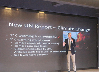 舒姆林先生讲座中特别提到了全球气候变暖问题,“许多发达城市沿海而建,但全球温度升高2℃,海平面就会升高6-9m,冰川地区的很多鱼类濒临灭绝,因为日益干旱的区域让生存在那里的鱼无法呼吸。威胁地球上的人与动物赖以生存的家园。因此,我们从现在开始要尽可能的利用可再生能源,减少二氧化碳的排放,这样我们才有可能在2050年前把全球气候升温的幅度控制在1.5℃以下。”