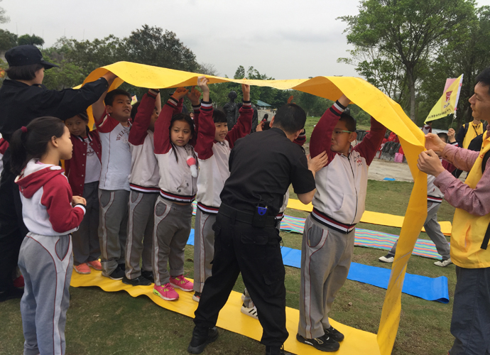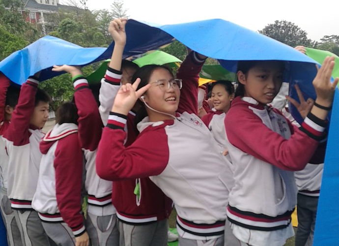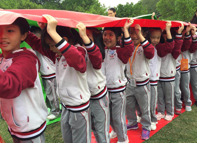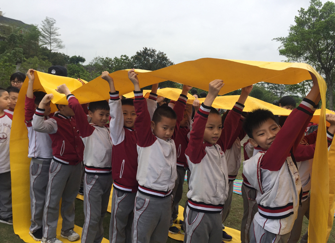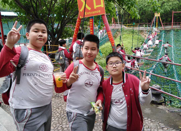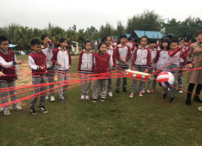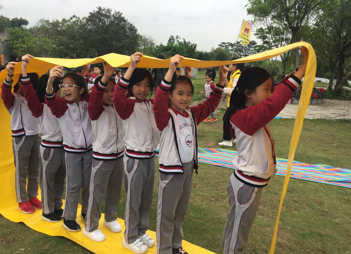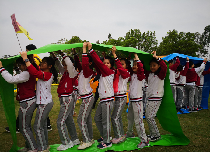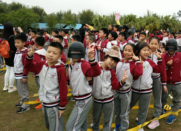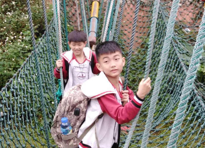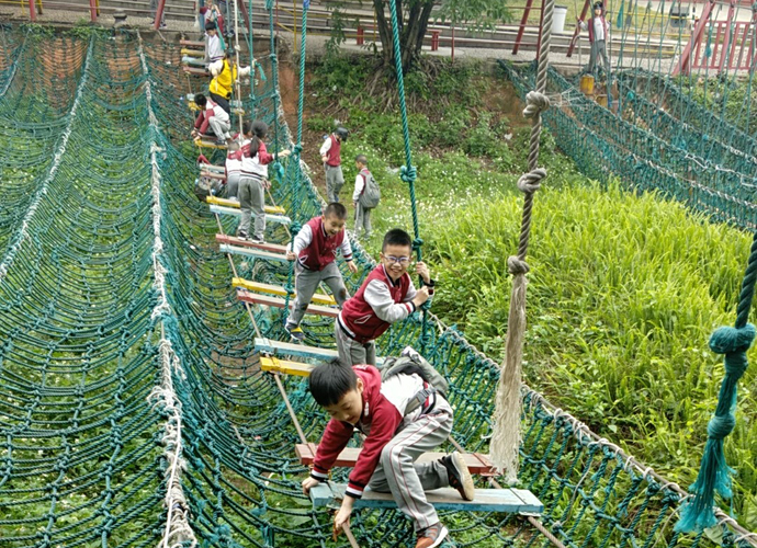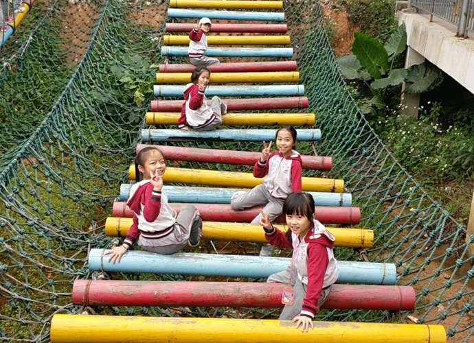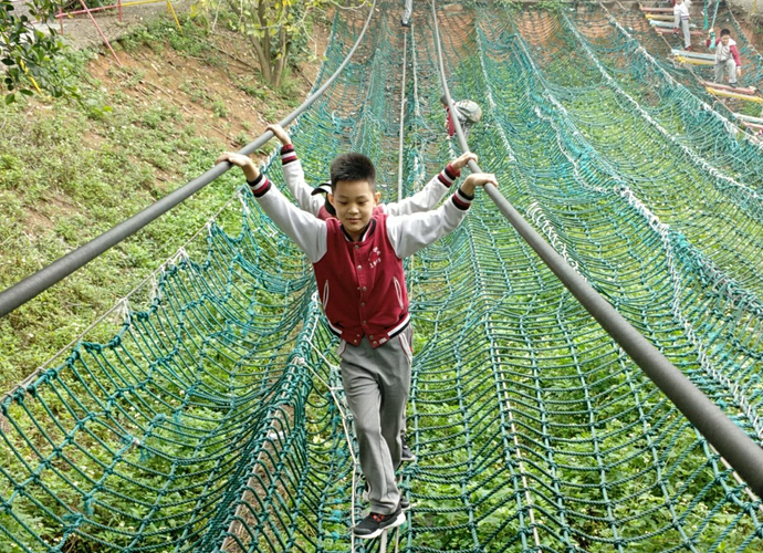 在景区,与岭南风情交错体验的有七十余项康体健身竞技娱乐游戏。低段的孩子们最感兴趣的是陆池竞技项目中的登梯爬高、木桩小通道、平衡木、钻铁圈等项目,难度系数虽然较低,但是对于他们来说还是有点小刺激的。而“网上”大比拼竞技则涵盖了平衡圆独木桥、圆木垮桥、钢管桥等多项运动项目,则吸引了很多的中高段学生,他们在竞技中挑战自我,增强勇气。