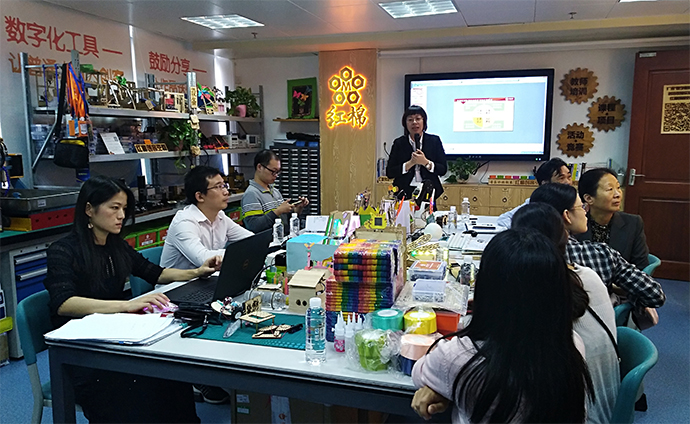 广州“数字教育城”创客教育实验室是国内电教系统中最先成立、且唯一具有自己创客教育团队的实验室,曾多次承担了全国和省市级的创客教育培训,树立了广州创客教育师资培训的品牌。实验室负责人龙丽嫦老师,详细介绍实验室创建过程和日常运营管理,并结合我校正在推进的科技创客中心建设,大家进行了充分交流。下阶段,将邀请龙老师对我校的创客基地建设与项目实施,到校进行更深入的专业指导。