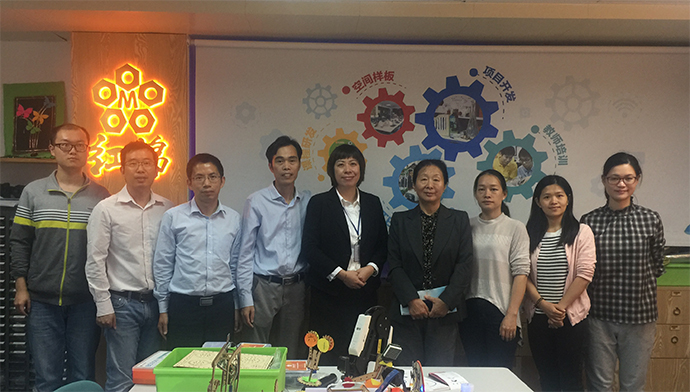 10月19日下午,我校科技教育的相关老师一行八人,由学校钟和军副校长带领,到访了广州市教育信息中心,对创客教育实验室和机器人教育培训基地进行全面参观和深入交流。