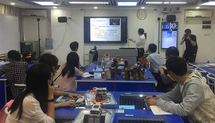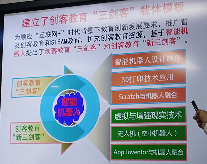 在机器人教育培训基地,项目负责人、全国十佳科技教练员王同聚老师,结合自身近二十年来参与青少年机器人创客教育的实践体会,给大家深入分析了机器人创客教育的发展现状和未来发展导向,这对我校的正在推进机器人教育课程建设,起到了很好的借鉴和启发。